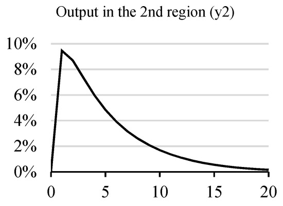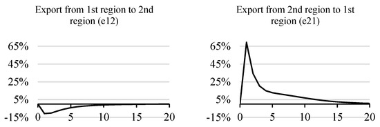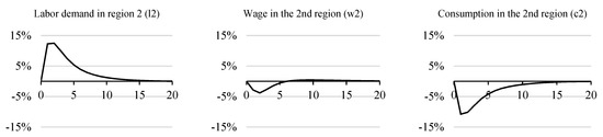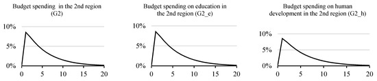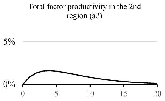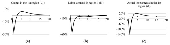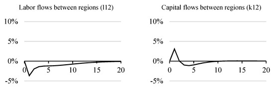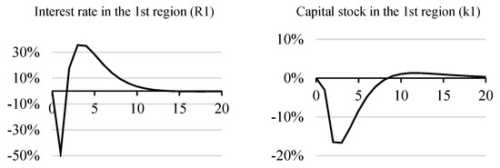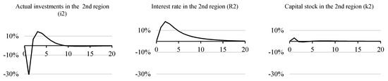 Finally, the capital market of the second region (Figure 12) shows a “displacement effect”—the growth of budget purchases increases the interest rate and reduces investment. The increased need for capital at first is covered by its import from the first region due to interest arbitration (in the second region, the percentage increases, while in the first region, it initially decreases).