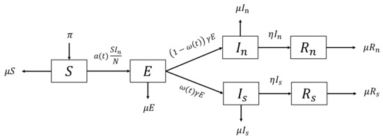We start the SEIR transmission model of COVID-19 with susceptible compartment S, exposed compartment under incubation period E, infected and infectious compartment I, and recovered compartment R. The overall process of infections is shown in Figure 1.