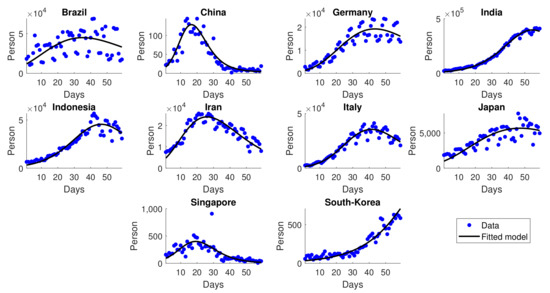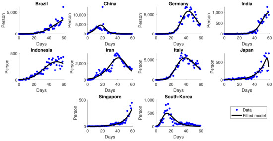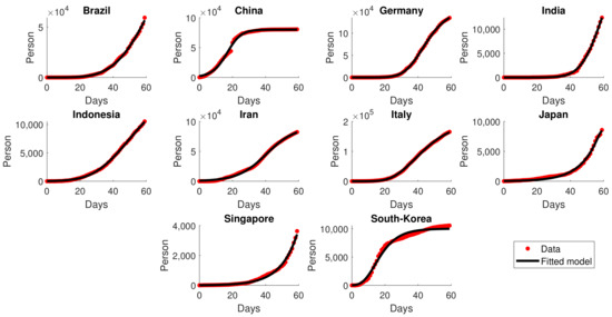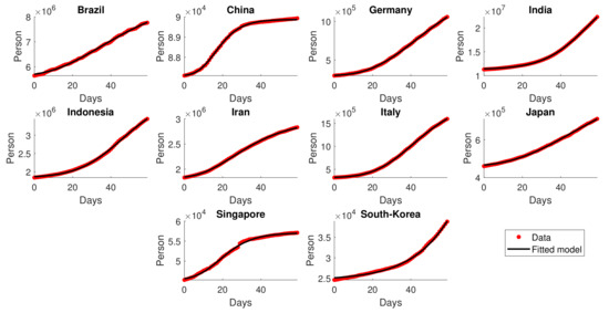 In this section, the numerical simulations for Model (1) that resulted from implementing the generating operator on the fitted cumulative function are shown. COVID-19 data are selected from ten countries representing different population sizes: Brazil, China, Germany, India, Indonesia, Islamic Republic of Iran, Italy, Japan, Singapore, and South Korea. The COVID-19 data are taken from the official website of Worldometer [37], consisting of the daily number of active cases and total recovery. The data were taken during the early transmission period ranges from late February until September 2021. In these simulations, only the first 60 days after the initial transmission will be used and analyzed. The interval for each country may vary depending on the initial transmission.