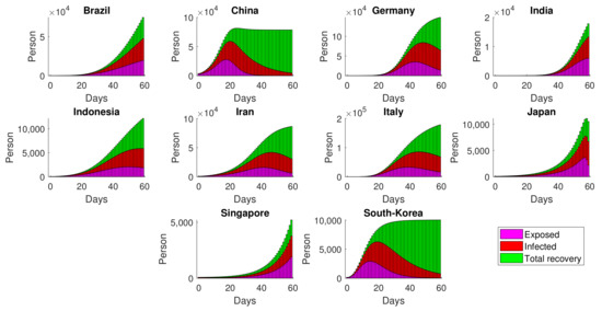 Given in Figure 6, the number of exposed cases dropped significantly in China and South Korea within the first 60 days, leaving no exposed cases in the late simulation. The success of the two countries in controlling the disease was the result of mobility restriction across the country [38], as well as the public participation in the implementation of COVID-19 protocols [39]. In other countries, such as Brazil and Singapore, the virus seems to not be rapidly spreading. However, the exposed cases gradually increased and had no sign of significant decrease within two months. Although Model (1) does not explicitly accommodate various interventions in the field, the time-dependent infection rate could represent the daily measure of infection due to the unmeasurable intervention and control.