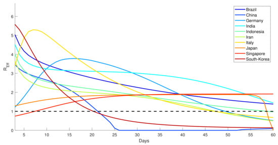 Figure 10 shows the estimation of for the ten countries. Italy and Germany have higher values than other regions, while Singapore is considered the lowest. This result shows that even though the simple formula was claimed to underestimate the true [45], the general pattern for the observed ten countries resulted in consistent results [34].