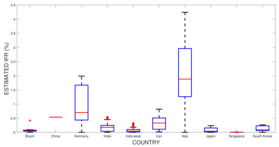 Estimated for the ten observed countries. The blue boxes represents the range from the lower to upper quartiles, with the median (red line) was chosen to represent the single point estimated . The black add signs depicts its maximum and minimum values of the estimated IFR.