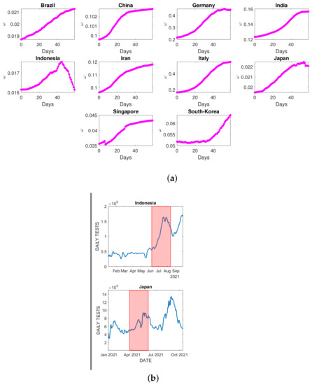 (a) Dynamics of estimated , 60 days after the initial second wave emerged; (b) the daily test experienced a significant drop in Indonesia and Japan during the simulation interval (in the red-shaded area).