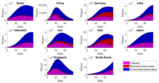 Simulation of E, I and R are obtained directly from substituting into and , respectively. For the ten observed countries, the dynamics of (Exposed–Infected–Recovery) are given in Figure 6, omitting the S compartment form visualization due to its scale problem.