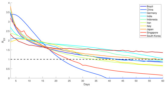 The basic reproduction numbers of the observed countries are given in Table 3 using Equation (2). Since the basic reproduction number calculation only applies to the autonomous system, we drop the time dependency of the transmission rate. Thus, we use the average number of the 60-day transmission rate. In comparison, the time-dependent effective reproduction ratio is depicted in Figure 7 as a measure of the daily performance of virus transmission. It is shown in Figure 7 that, except for China and South Korea, other countries took much longer to reduce the effective reproduction ratio to below one.