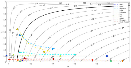 Specifically, in the second transmission, it is intriguing to learn how the countries’ intervention-related parameters, i.e., and , evolve over time. Depicted in Figure 15 is the countries’ profile situated in the contour plot, which is representing the effective reproduction number but omitting the term , i.e., . This formula is nothing but the effective reproduction number, which has not taken the dynamics of the susceptible populations into account. On day 1 of the second transmission, it is indicated that all countries experienced significant transmission of COVID-19 with a relatively low transition rate . As time evolved, all countries simultaneously moved to the left with lower reproduction numbers, and we ended up with five countries that were assigned with reproduction numbers higher than one at day 60. To be compared with that depicted in Figure 14, there were only two countries that had effective reproduction numbers higher than one at day 60. Since the reproduction numbers depicted in Figure 15 are omitting the role of , there are three countries that had a significant effect of susceptible population size on suppressing the effective reproduction number, i.e., Indonesia, Japan, and Brazil. In other words, the three mentioned countries have passed below one in regards to because of the significant deviation of compared to N. Since the dynamics of S at every time point are dependent on all other variables, this indicates that the unrecorded infections and recovery have had a significant effect on these countries. Acknowledging that these three are densely populated countries, the high estimated number of unrecorded infections and recovery has resulted in an of below one at day 60.