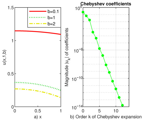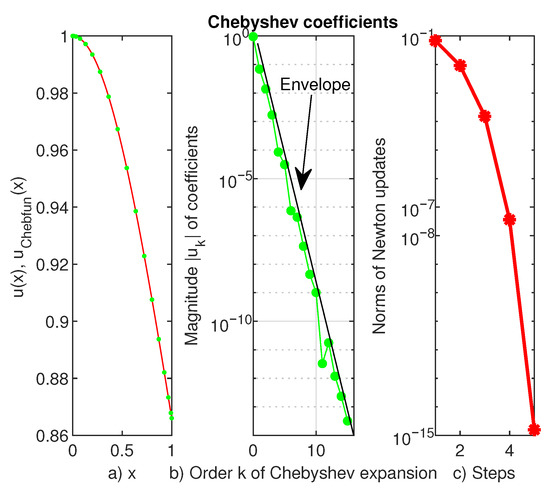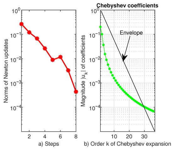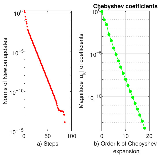 (a) The convergence of Newton’s method in solving problem (13) when . (b) In a log-linear plot we display the decreasing behavior of the Chebyshev coefficients (green dots) of solution to the same problem.