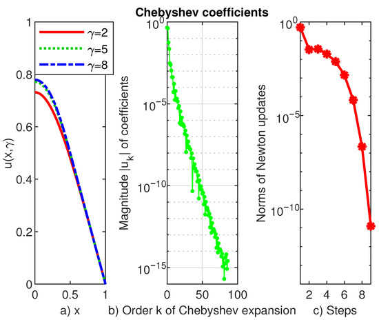 (a) Three solutions to the problem (16) when . (b) This panel shows that when the Chebyshev coefficients of solution decrease almost linearly close to the machine precision with a slope a little bit larger than . (c) Newton updates are illustrated for the same value of