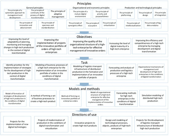 The structure of the proposed methodological foundations of management and development of high-tech enterprises in terms of digital transformation is shown in Figure 1. It is represented by principles, goals, objectives, models and methods, and possible directions of application.