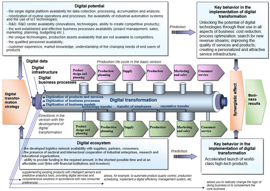 Initially, the enterprise has a certain digital potential, is part of a certain digital ecosystem, and decides to implement a portfolio of digital transformation projects. The digital transformation strategy is based on digital awareness of the challenges and opportunities associated therewith, as well as strategic correspondences of production, technological, and business process chains. Strategic correspondences can be found in any part of the chain of processes: in R&D and technology, in the supply chain, supplier relations, manufacturing, sales, and marketing within administrative functions. For example, digital transformation projects, in which companies share technology and technological know-how, create valuable competitive advantages by reducing R&D costs, accelerating the launch of new high-tech products, and using new technological advances to implement new projects and programs.