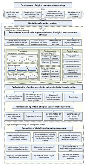 The concept of digital transformation management in a high-tech enterprise is based on several interdependent adaptive systems: planning and formation, monitoring, and management of changes (Figure 5).