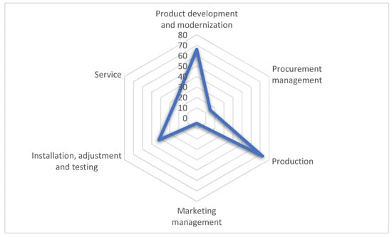 Therefore, the calculations showed that the key digital assets of the enterprise are most actively involved in the implementation of business processes for manufacturing, product development, and installation and commissioning (Figure 6).