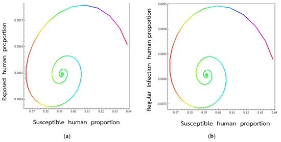 - Van den Driessche, P.; Watmough, J. Reproduction numbers and sub-threshold endemic equilibria for compartmental models of disease transmission. Math. Biosci. 2002, 180, 29–48. [Google Scholar] [CrossRef]
