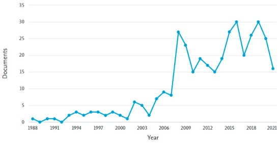 The search was performed on the field’s article title and keywords and only considered computer science and engineering subjects. Only works published until 2021 were considered. The search was performed in November 2021 and resulted in 370 studies. The 370 studies included in the analysis were published between 1988 and 2021 (see Figure 1). The graph shows the growing interest that has taken place over the years, mainly from 2008 onwards. In the analysis, it is necessary to consider that a significant part of the 2021 publications may not yet be available in the database.