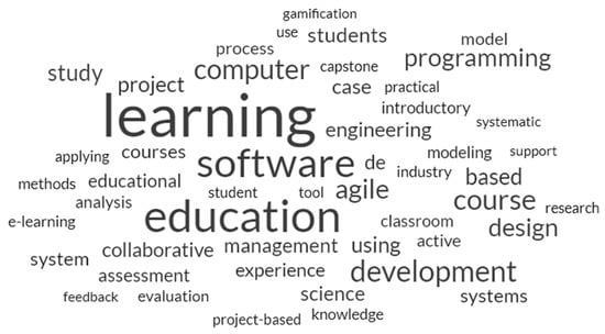 An analysis of the titles and abstracts of the selected articles makes it possible to identify some of the most discussed terms. After excluding the keywords used in the search, the keywords of the works were analyzed to obtain a characterization of their frequency. Figure 3 shows the tag cloud that was obtained based on these results.