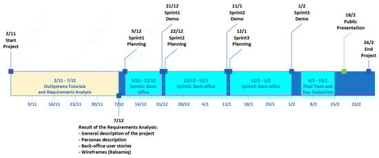 The development process adopted was very close to the one typically used in the company for business purposes. In this way, students are included in a work environment similar to what happens in a professional environment. For the development process, Scrum was followed, in which the roles of each one were as described above in Section 5.2. In defining each sprint backlog, the volume of work, the user stories assigned to each sprint, and other academic commitments (workload with exams, assignments for other subjects, etc.) of the students were also considered. Both the product backlog for each semester and the corresponding sprint backlogs resulted from a process of great participation from all the team members. However, it is up to the product owner to validate the priorities in terms of user stories for each sprint. Backlogs and user stories were recorded using the Trello tool, which enabled the monitoring and recording of work in progress, with visibility for all team members. Another important aspect of planning is that at the beginning of each semester, a timeline is defined with the dates of all sprints, including the milestones to be reached, so that there is a detailed plan of goals to be achieved. Figure 6 presents the timeline of the first semester of this project.