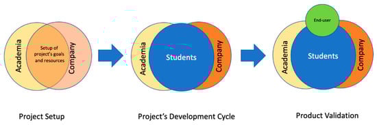 The courses of higher education, namely licentiate degrees, take place in polytechnic institutes for three years (six semesters) and, in the last year, there are internships or project subjects. During this period, it is intended that the students consolidate the knowledge acquired in the other subjects of the respective course and acquire new knowledge (technical and behavioral), in addition to that learned so far. Given the youth of these undergraduate students, this antechamber of preparation for the labor market can be especially useful in providing them with valuable skills for the transition from academia to industry. Some approaches in higher education schools follow an internal scope (without involving companies) with a major focus on research and improving the students’ self-learning skills. On the other hand, other approaches, such as the approach presented here, argue that for these students, it is particularly important that this period is invested in improving the students’ skills (technical, behavioral, planning, team integration, interaction with others, global vision of a project, etc.) for what companies require at the moment. For this, it is crucial to involve companies not only as recipients of products/prototypes they request (quite common) but as they are an active and present part of the students’ teaching process. Besides resulting in a high-quality product for the company, this participation should also allow the student to acquire experience with development processes used in a company context and an accurate notion of what should be the best practices and the artefacts and tools to use to build a professional software project from scratch. To achieve these goals, it is vital that there is good availability and continuous collaboration between the staff of the company, the staff (teachers) of the teaching institution, and the students (throughout the project, in this case, the fifth and sixth semesters of the course).