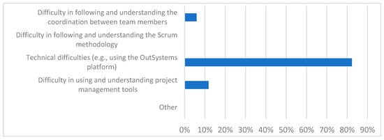 The most frequently mentioned difficulty concerned technical difficulties associated with using the OutSystems LCDP (14 times mentioned in 17 responses). This may be associated with the fact that 78.6% of respondents had no previous contact with the platform before starting this project. It also reflected some difficulties in the initial adaptation to the OutSystems LCDP, corroborating the result obtained in the question “How was your adaptation to OutSystems development platform?” in Table 6.