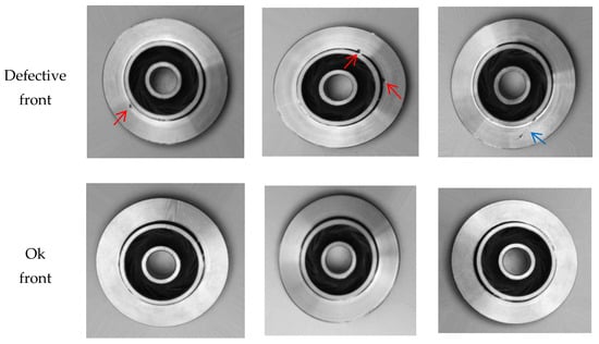 Def-front and ok-front samples from the dataset. Pinholes are marked with red arrows; scratches are marked with a blue arrow.