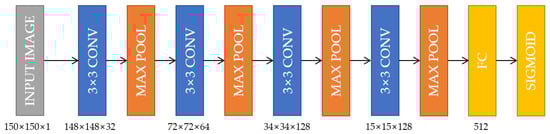 All convolution layers used a 3 × 3 size filter with an activation function, a rectified linear unit (ReLU). Max-pooling layers, located directly after each convolution layer, used a 2 × 2-sized filter. We used binary cross-entropy as a loss function, and adaptive moment estimation (Adam) as an optimizer. Firstly, input images passed through the convolution layer and the max-pooling layer alternately four times and entered the flattened layer. Subsequently, they entered a dropout layer, used to prevent overfitting, and finally passed through two dense layers. They each had an activation function, ReLU and Sigmoid, respectively. We trained the models for 30 epochs and used a batch size of 16. The structure of the architecture is shown in Figure 3. Summaries of the layers and the parameters of the model are shown in Table 2.
