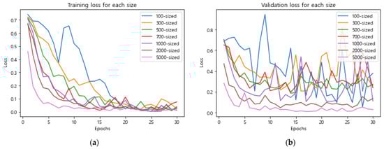 (a) Loss change in training set for each size; (b) loss change in validation set for each size.