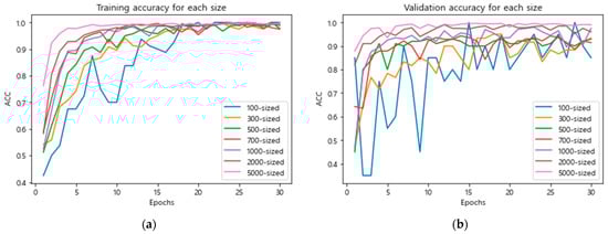 (a) Accuracy changes in training set for each size; (b) accuracy change in validation set for each size.