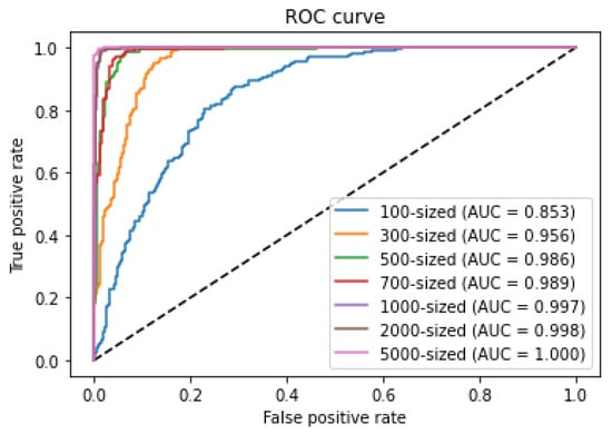 Figure 6 shows the ROC curves of each sample size. The AUC value, which means the area under the curve, ranges from 0.5 to 1; the closer to 1, the better the performance. The AUC value increases as the size of the dataset grows. As Figure 6 shows, the AUC value of the 5000-sample dataset reached 1.000, which is the optimum value of AUC.