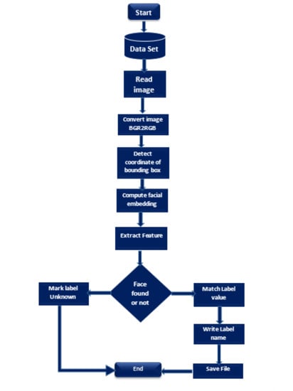 Our faces have different features that can be identified, such as our eyes, mouth, nose, etc. We used the Dlib algorithm to detect the face and we obtained a map of the point that surrounds each feature. For the Dlib facial recognition, the output is computed by 128-d and the training of the network is completed by using the triplet dataset. Figure 5 represents the overall flowchart of the proposed research.