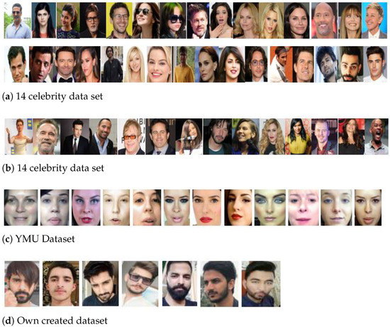 The proposed research methodology is evaluated on four different datasets, namely: three open benchmark datasets named Face Recognition dataset, 14 celebrity dataset, Virtual Makeup (VMU) dataset [23], and our own created dataset. We have created our own dataset consisting of 700 images of 7 people with 100 images of each person. We used the 80/20 and 70/30 rule for dataset training and testing. Table 1 shows the dataset used for the evaluation of the proposed research methodology. The sample images from each image benchmark are shown in Figure 6, respectively.