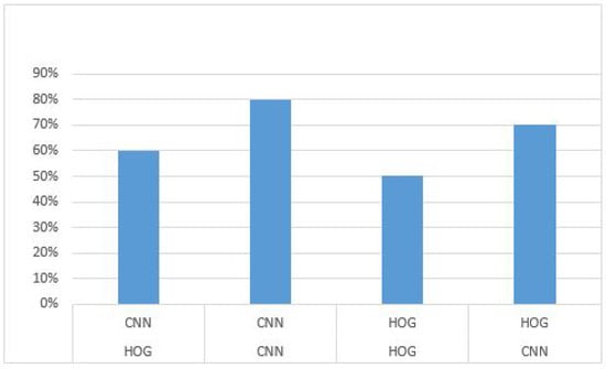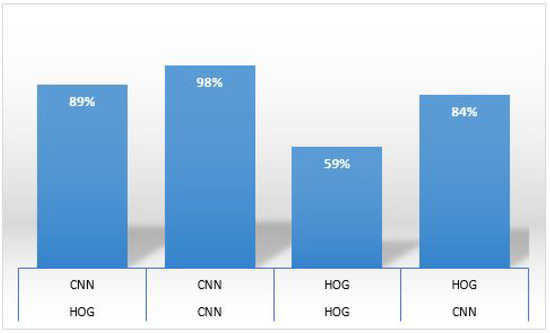 In Figure 7, the first row of the label indicates the model we used for the training of our dataset and the label in the second row represents the model we used for testing to extract the feature from the input video and match it with the trained data. The first bar in Figure 7 shows that the accuracy of the CNN model is 89%, when we trained dataset using CNN and tested the system by the HOG feature descriptor. Similarly, the second bar depicts that the accuracy of CNN is 98%, when we used CNN for both the training and testing of the system. The third bar shows that accuracy to recognize face from video is 59% when we used the HOG feature descriptor for both the training and testing of the system. Bar 4 shows that the accuracy to recognize the face from the video is 84% when we trained the model on the HOG feature descriptor model, and CNN is used to extract features of a face from the input video and match them with the trained dataset.