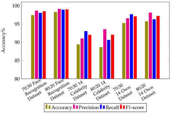 Our own created dataset contains a total of 700 images of seven different people, 100 of each. Its accuracy is higher than the 14 celebrity dataset because the dataset size is also larger than the 14 Celebrity dataset. Model accuracy, precision, recall, and F1-score is 95.23%, 96.51%, 97.64%, and 97.07% when we train and test the model on 70:30 ratio; while the ratio is changed from 70:30 to 80:20, its accuracy, precision, recall, and F1-score are 97.71%, 98.09%, 96.26%, and 97.16%, respectively, as can be seen in Table 6.
