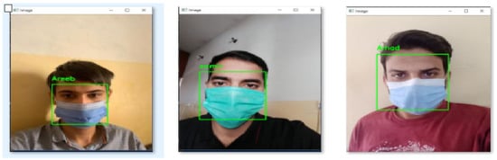 Now we will discuss the results associated with the self created dataset. The accuracy of HoG and CNN while using our own created dataset is shown in Table 7. The output images with face masks and detected labels are shown in Figure 16. During COVID-19, almost every person was wearing a face mask. It is difficult for the already existing system to recognize a face in a mask and if the system does recognize it, its accuracy is low because the system is trained on faces without masks. So, we trained an efficient system that recognizes faces in masks [58].