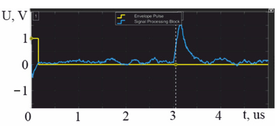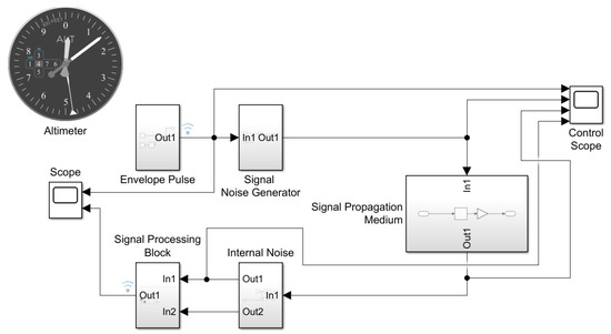 The structural diagram of the radar used for simulation is shown in Figure 2. The work of the model is as follows. The Envelop Pulse block generates an envelope of a noise pulse signal, which is then sent to the Signal Noise Generator block, which forms a wideband pulse stochastic signal. The generated radio pulse passes through the Signal propagation medium unit. In this unit, the signal is delayed for a time equivalent to a distance to the underlying surface of 1476 feet. This block also takes into account the dissipative properties of the signal propagation medium, as well as the fact that the radio pulse is reflected from the extended surface. The delayed signal is made noisy by the Internal Noise block and goes to the Signal Processing block, which performs the transformation in accordance with the algorithm (33). As mentioned earlier, algorithm (33) does not allow direct estimation of the range or the corresponding signal delay time. Thus, an envelope is observed at the output of the Signal processing block, which is further detected and based on which the delay time and the corresponding altitude to the underlying surface are calculated.