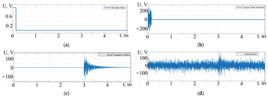 Signals at the blocks output: (a) pulse envelop; (b) signal noise generator; (c) signal propagation medium; and (d) internal noise.