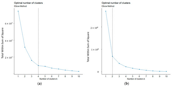 The optimal number of clusters based on the elbow method: (a) Clustering period 1 July 2021–30 September 2021, (b) clustering period 1 January 2022–31 May 2022.