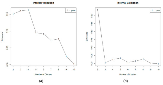 The homogeneity of the clusters created was measured using silhouette width in this study. Silhouette width is a metric that takes into account both compactness and non-linear separation [46]. The average silhouette width for each observation is the average of silhouette value for every objects that belong to a certain cluster. The silhouette value indicates the amount of confidence in the dataset’s placement in a cluster of specific observations, with a value near to 1 indicating a good cluster and a value close to −1 indicating a bad cluster, with the i-th observation, defined as