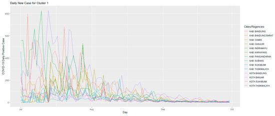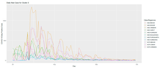 Figure 4 shows the development of the number of daily positive cases of COVID-19 in Cluster 1 in the period 1 July 2021–30 September 2021. This cluster is the cluster with the most members, namely 14 cities/regencies. Characteristics that can be observed through the graph in this cluster: it can be seen that this cluster is a cluster in which, when the emergency PPKM was implemented, namely on 3 July 2021, the number of daily positive cases of COVID-19 that occurred was increasing. Then, 14 days after the first time the emergency PPKM was carried out, namely on 17 July 2021, in this cluster there were signs of a decrease in daily positive cases of COVID-19. When PPKM 4 Level was implemented, namely 26 July 2021–2 August 2021, in this cluster, almost all cluster members began to experience a significant decrease in cases when compared to the worst conditions that had been experienced before. The last characteristic of this cluster is the steady decline in cases, which continued until 30 September 2021.