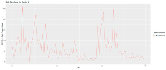 Figure 6 shows the development of daily positive cases of COVID-19 in cluster 3. This cluster is unique because it only consists of one city, namely Bogor City. The unique characteristic that can be observed through the graph in this cluster is that it experienced two peaks, namely when the emergency PPKM was implemented, on 3 July 2021 and in the period 26 August 2021–16 September 2021. This cluster experienced a decrease when the Level 4 PPKM was implemented, namely on 26 July 2021, and continued to decline until 23 August 2021, but what distinguishes this cluster from other clusters is that in this cluster, there was an increase again on 26 August 2021–11 September 2021; then, they again experienced a decrease in cases that continued to occur until 30 September 2021. This cluster is a cluster that experienced a second wave since the emergency PPKM and Level 4 PPKM were implemented. This indicates an ineffective implementation of PPKM in this city, as a given in Figure 6.