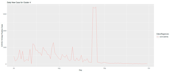 Figure 7 shows the development of daily positive cases of COVID-19 in Cluster 4. This cluster is unique because it only consists of one city, the same as Cluster 3, namely Depok City. The unique characteristic that can be observed through the graph in this cluster is that it can be seen that this cluster experiences a peak or worst-case scenario in different periods when compared to other clusters. This cluster peaked on 21 August 2021–26 August 2021, and this happened suddenly. In contrast to other clusters, which in the same period actually decreased, when the emergency PPKM and Level 4 PPKM were implemented, this cluster experienced a fluctuating number of daily positive cases of COVID-19. This cluster experienced a significant decline on 27 August 2021. At that time, the number of daily cases that occurred was 110 cases, very different from the previous day where the number of daily positive cases was 3341 cases. Furthermore, during 28 August 2021–30 September 2021, this cluster experienced a steady decline. This cluster is unique with peaks that occurred at different periods than other clusters, and it occurred very suddenly, which indicates an ineffective implementation of PPKM in this city.