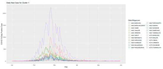 Clusters of daily COVID-19 cases in cities and districts in West Java.