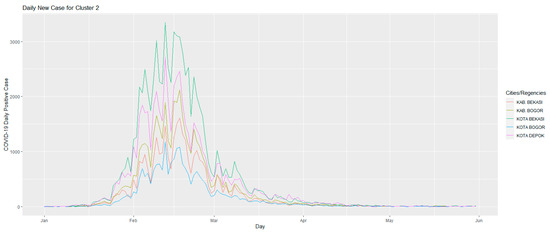 Figure 5 shows the development of daily positive cases of COVID-19 in Cluster 2. This cluster consists of 11 cities/regencies for the period 1 July 2021–30 September 2021. Characteristics that can be observed through the graph in this cluster: it can be seen that this cluster is a cluster that, when PPKM starting to be implemented, namely on 3 July 2021, was not experiencing an increase in daily positive cases, different from Cluster 1. This cluster began to experience an increase which began on 13 July 2021, and this lasted until 25 July 2021, then began to experience a steady decline after the Level 4 PPKM began to be implemented, namely on 26 July 2021. In the period August 2021–September 2021, cities and towns and cities districts that are members of Cluster 2 no longer experienced a significant increase in cases, and were steadily decreasing. This indicates that the policies taken were appropriate to reduce the number of daily positive cases of COVID-19 that occurred in Cluster 2, given in Figure 6.