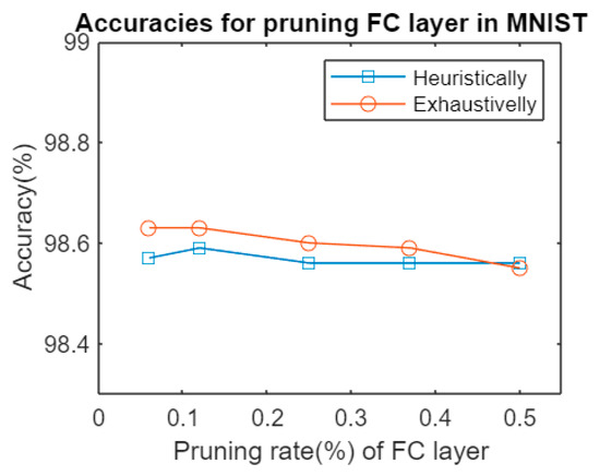 Figure 3. Accuracies for pruning an FC layer in the alternative architecture heuristically vs. pruning exhaustively.