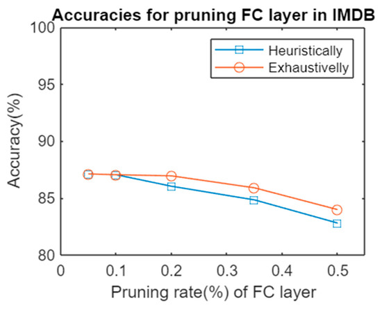 There were similar findings in the network composed of three FC layers when testing on an IMDB dataset. The differences between both methods were not significant, but the computation effort differed completely between them, as summarized in Table 4. Figure 3 shows the accuracies for pruning using both alternatives.
