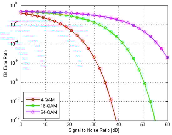 Note the classical expression for BER determined by the Signal-to-Noise Ratio (SNR), for the M-QAM signal transmission over the AWGN channel [22]: