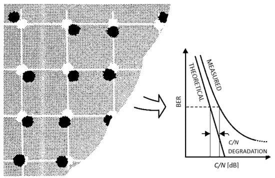 Applying link abstraction, any distortion, be it additive Gaussian or not, can be considered equivalent to that much additive Gaussian noise that would result with equal BER degradation, i.e., shift the BER(SNR) curves to the right for the adequate SNR degradation. This is shown in Figure 2, as the non-AWGN degradation of the 16 QAM modulation symbols (visible on the part of the constellation on the left) is modeled by the carrier-to-noise (C/N) degradation for the same BER value.