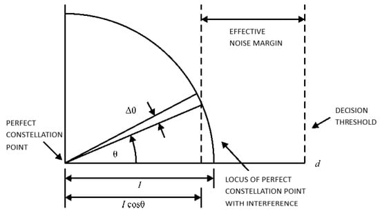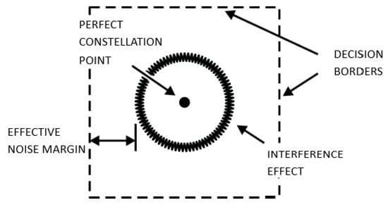 As an illustrative example, let us derive a simplified model of radio interference by superposing a narrow-band interfering signal (such as, e.g., dominantly from an adjacent channel) to the information-carrying one, thus reducing the effective noise margin, as shown in Figure 3.