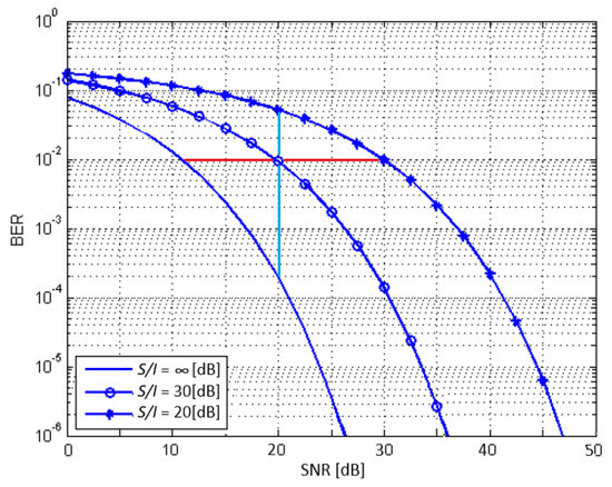 Specifically, moving to the right along the red horizontal line of constant BER = 10−2 from the middle curve for S/I = 30 dB, to the line crossing with the utmost right curve for S/I = 20 dB (i.e., increasing the interference for 10 dB), is tracked by almost equal increase in the SNR value.