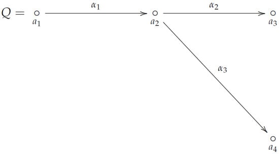 The following Figure 2 shows a quiver Q with four vertices , , and and three arrows , , and . Note that, is the set of paths of length 1, whereas is the set of paths of length 2 in Q.