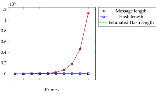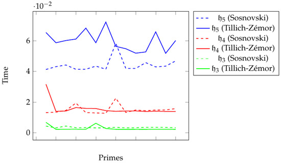 Table 4 and Table 5 give the execution time to compute Tillich–Zémor and Sosnovski hash values of the Brauer messages. Figure 10 shows how Brauer messages are compressed by Sosnovski hash values. Figure 11 shows a comparison between execution times to compute Sosnovski and Tillich–Zémor hash values of the Brauer messages , and for prime numbers to given in Table 4 and Table 5.