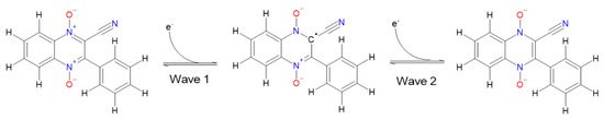 Research into quinoxaline 1,4-di-N-oxide derivatives is of interest to the pharmaceutical community, as these compounds have been associated with a wide range of bioactivities including anti-tumor, anti-cancer, antimicrobial, antiparasitic and antioxidant [1,2,3,4,5,6,7,8,9,10,11,12,13]. As a result, a significant number of new quinoxaline 1,4-di-N-oxides are designed, synthesized, and tested for biological properties each year [14]. While the exact mechanism for the bioactivities is not known for most quinoxaline 1,4-di-N-oxide derivatives, it has been observed that bioactivity is often linked to the ease of reduction for homologous derivative series [9,15,16]. For some quinoxaline 1,4-di-N-oxide derivatives, it has been shown that they produce a free-radical species capable of cleaving DNA under hypoxic conditions [17,18]. The formation of the free radical is believed to cause cellular oxidative damage and is presumed to be a common bioactivity mechanism for the quinoxaline 1,4-di-N-oxide derivatives [17,18]. Figure 1 shows the first (wave 1) and second (wave 2) reductions of the diazine ring in the parent 3-phenyl-quinoxaline-2-carbonitrile 1,4-di-N-oxide molecule.